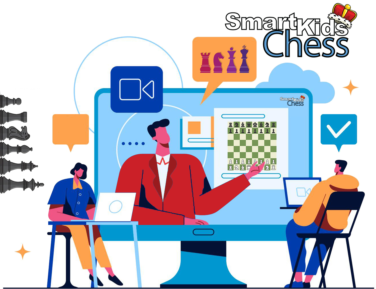 Smart Kids Chess delivers a HIGHLY UNIQUE way to helping kids remember the game of chess, play faster and with more strategy and using our real-time interactive platform coupled with our online kids entertaining broadcasts to deliver chess lessons like they’ve never experienced them before…its like they are learning in-person but only online with their friends.